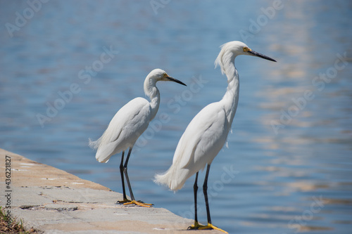 Snowy Egrets stand on the water's edge in downtown St. Pete, Florida by the boat yard and dock.