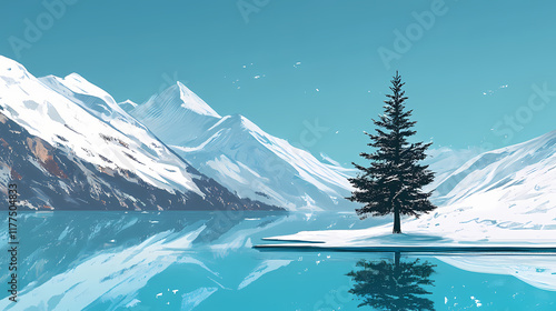 Snowy fir tree stands alone by a tranquil, turquoise lake, reflecting snowcapped mountains under a clear blue sky. Snowcap. Illustration