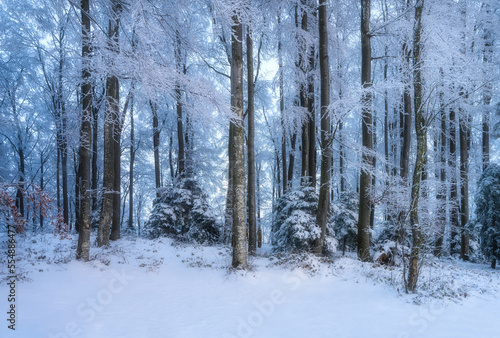 Snowy forest in amazing winter at sunrise. Colorful landscape with trees in snow, orange sky at dawn in mountains. Snowfall in woods. Wintry frozen woodland. Snow covered forest. Trees in hoar Nature
