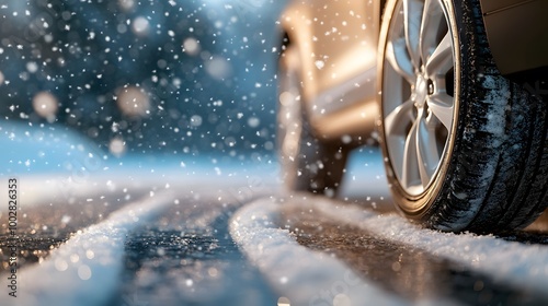 Snowy, icy road with detailed tire tracks, highlighting winter driving.