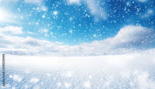 Snowy landscape with blue sky and clouds, with falling snowflakes or sparkles.