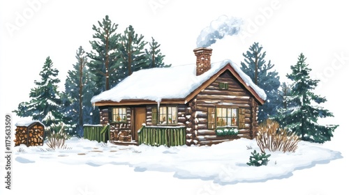 cabin, winter, snow, log, house, forest, christmas, holiday, illustration, cosy, snowy, landscape, nature, home, fireplace, snowdrift, wood, tree, rustic, cute, traditional, scenery, peaceful, calm, elegant, design, digital, art, graphic, isolated, background, decoration, image, cold, exterior, bungalow