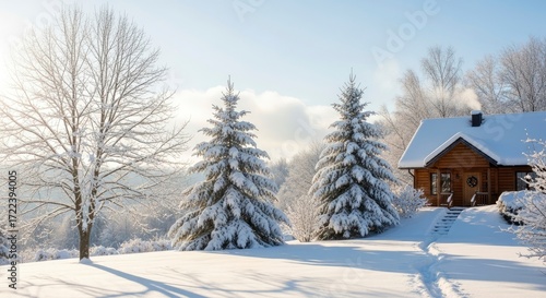 winter, snow, snowy, cabin, filed, house, home, wood, wooden, log, chimney, smoke, roof, white, cold, freeze, frosty, bright, sun, sunny, sunlight, light, sky, blue, cloud, tree, tree, evergreen, pine, spruce, deciduous, bare, branch, forest, nature, landscape, rural, tranquil, peaceful, serene, day, path, footstep, shadow, beautiful, picturesque