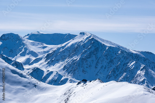 Snowy mountain peaks not far from Almaty, mountain views from kumbel peak. A popular tourist route in the mountains.