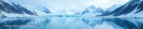 Snowy mountain peaks reflected in the glacier's icy surface, nature, serene
