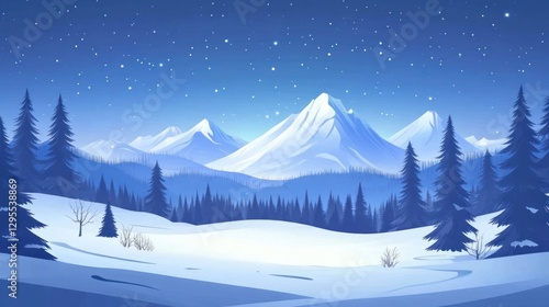 snow, mountain, winter, pine, tree, landscape, night, star, sky, blue, white, scenery, cold, christmas, forest, nature, outdoors, scenic, season, background, december, frost, snowy, frosted, calm, peaceful, holiday, illustration, cartoon, design, graphic, wallpaper, art, artistic, glacé, peak, range, vale, horizon, fir, quiet, evening, wilderness, solitude, pristine, powder, alpine
