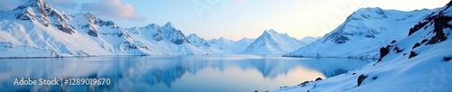 Snowy mountains with a frozen lake in the distance, water, lake