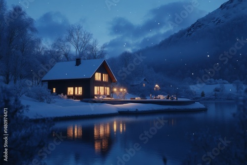 winter, snow, cabin, cosy, night, lake, serene, tranquil, blue, evening, landscape, nature, peaceful, mountain, tree, forest, rural, scenic, house, illuminated, light, sky, star, cold, frost, holiday, retreat, get-away, quiet, remote, outdoors, idylli, picturesque, calm, relaxation, wilderness, snowy, countryside, chalet, water, snowflake, dusk, wintery, alpine, northern, aethereal, tranquil scene