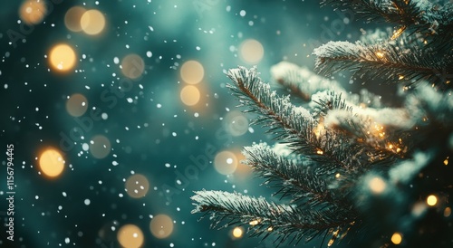 Snowy Pine Branches with Soft Glowing Lights in Winter Wonderland Atmosphere, Ideal for Holiday Season Decor and Festive Celebrations
