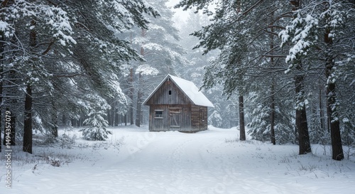 Snowy Pine Forest Cabin Path - Winter wonderland, secluded wooden cabin, snow-covered pines, peaceful path, tranquil escape. Symbolizing solitude, serenity, nature's beauty, winter charm