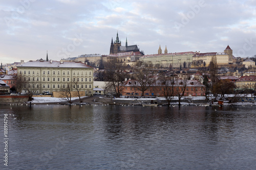 Snowy Prague Lesser Town with gothic Castle above River Vltava, Czech republic
