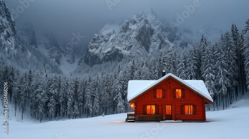 Snowy red chalet, mountain landscape, warm light, peaceful winter scene