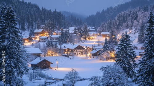 snow, village, house, illuminated, light, twilight, dusk, evening, winter, mountain, tree, forest, pine, fir, snowy, landscape, scenic, tranquil, serene, peaceful, quiet, magical, cosy, warm, alpine, chalet, swiss, austria, europa, cold, frost, glacé, night, dark, blue, white, brown, yellow, sky, horizon, nature, travel, destination