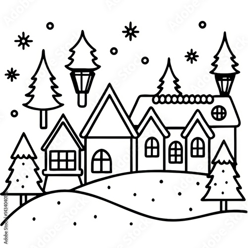 Snowy Village Scene Featuring Reindeer and Festive Winter Elements in Black and White