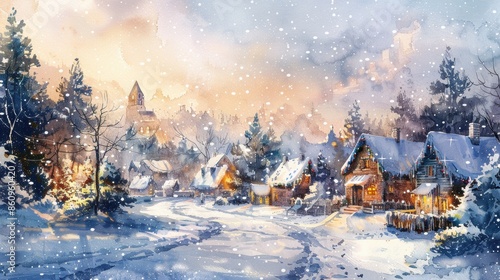 "Snowy village scene in winter, cozy cottages and twinkling lights, charming and detailed watercolor illustration, festive and serene atmosphere