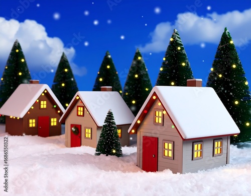 Snowy village scene with illuminated houses