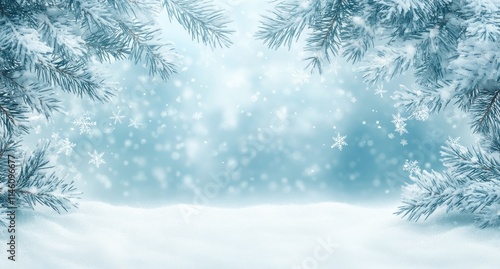 Snowy Winter Background with Frosted Pine Branches and Gentle Snowfall Creating a Serene and Tranquil Atmosphere for Seasonal Holiday Themes