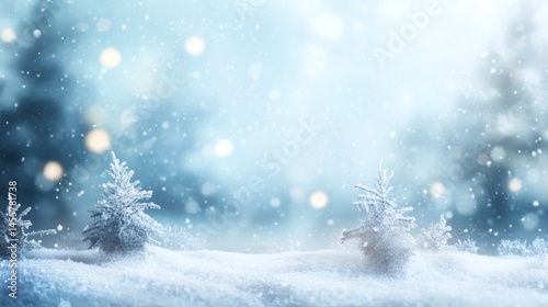 Snowy winter landscape, frosted trees, bokeh background; holiday greeting card