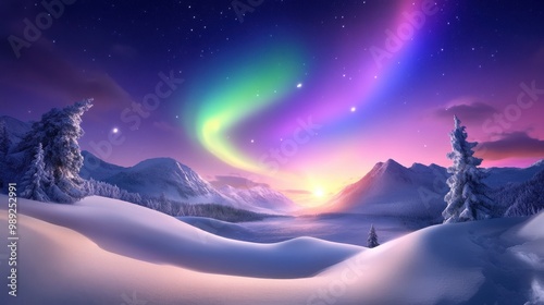 Snowy winter landscape illuminated by vibrant northern lights dancing across the night sky, casting a magical glow over the snow-covered ground.