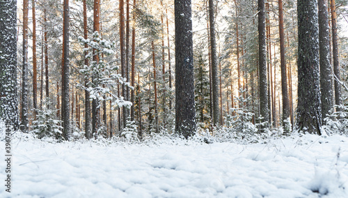 Snowy winter landscape panorama with forest and sun rays. Winter sunset in forest. Sun shines through snow covered trees. Winter morning nature