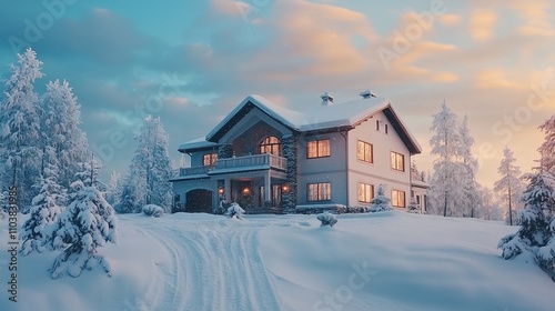 Snowy winter landscape with a big cozy house showing the front side and pine trees
