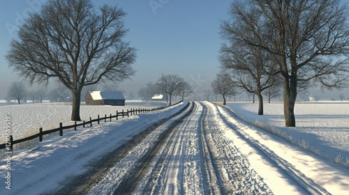 snow, winter, landscape, rural, road, tree, farm, barn, scenic, nature, cold, sky, frost, path, countryside, tranquil, serene, weather, horizon, season, idylli, peaceful, solitary, atmosphere, environment, clear, sunlight, blue, farmland, track, snow-covered, scenic route, calmness