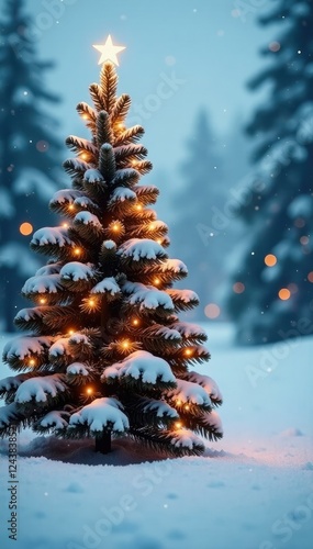 Snowy winter scene with Christmas tree on white background, winter scene, festive atmosphere