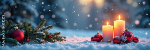Snowy winter scene with ornaments, garland and candles , garland, snow