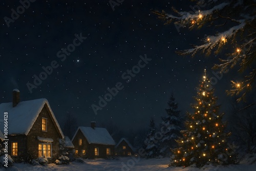 Snowy winter village with glowing Christmas tree festive holiday seasonal wallpaper cozy New Year background decoration design
