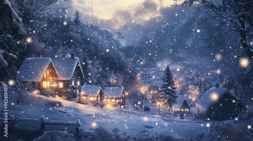 snow, winter, village, house, illuminated, night, falling, sky, tree, forest, mountain, landscape, cold, cosy, christmas, magical, peaceful, quiet, serene, romantic, dreamy, fairy tale, rustic, cabin, bungalow, light, glow, blizzard, frost, season, nature, dark, white, blue, yellow, orange, gold, light, shadow, atmosphere, mood, art