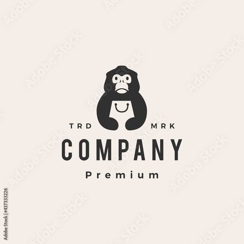 snub nose monkey shop shopping bag hipster vintage logo vector icon illustration