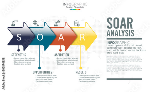 SOAR banner infographic for business analysis, strength, opportunities, aspirations and results.