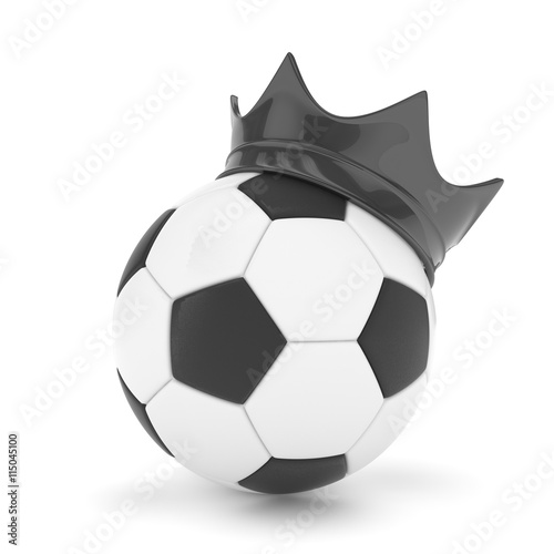 Soccer ball with black royal crown is a symbol of competition and winner's trophy on white. 3D rendering.