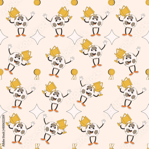 Soccer ball with cup seamless pattern. Football retro cartoon endless background. Groovy mascot repeat cover. Sport championship loop ornament. Vector illustration.