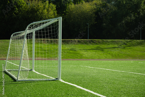 Soccer goal on field with artificial green grass. Summer outdoor game.