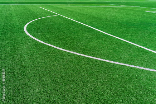 Soccer white marking lines of the Penalty arch area on artificial synthetic green grass turf
