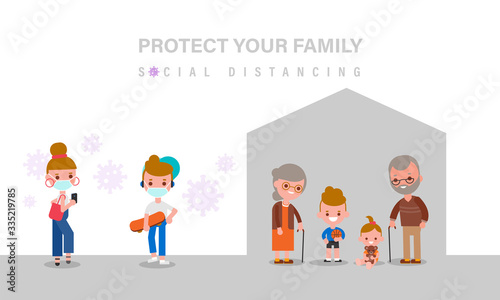 concept, illustration, family, home, elderly, virus, vector, stay, children, senior, face, away, keep, isolation, preventive, pandemic, disease, social, man, protection, distance, avoid, safety, infection, health, medicals, character, mask, quarantine, corona, cartoon, infected, group, white, isolated, people, background, young, male, female, adult, person, connection, woman