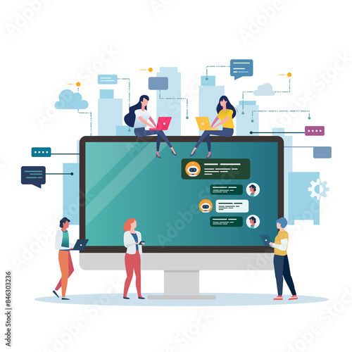 social, media, computer, screen, vector, work, using, network, tablet, desk, desktop, icon, community, concept, audience, flat, cartoon, technology, background, smartphone, guy, addiction, blue, online, student, keyboard, girl, city, together, male, infographic, illustration, woman, cyberspace, modern, crowd, urban, city landscape, symbol, female, chat, business, education, artificial, intelligence, robot, communication, message