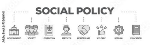 Social policy banner web icon illustration concept with icon of education, reform, services, welfare, health care ,legislation, society, government icon live stroke and easy to edit