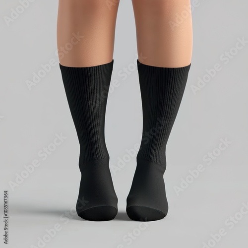 Socks mockup, black blank crew socks on a woman's legs with a white background