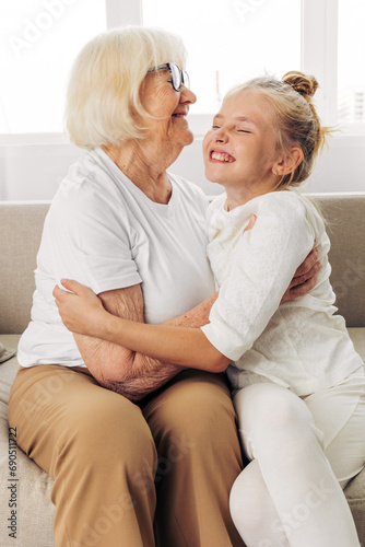 Sofa couch grandmother girl family home granddaughter hugging child love