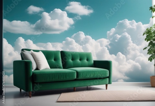 Sofa in the room and sky wall with big white clouds
