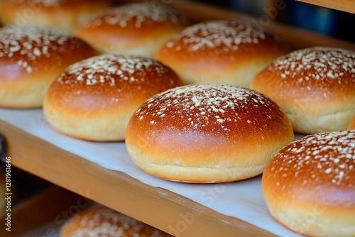 Soft and glossy buns with a golden-brown crust are lined up on a wooden shelf. The bakery setting is warm, inviting, and filled with the tantalizing aroma of fresh bread