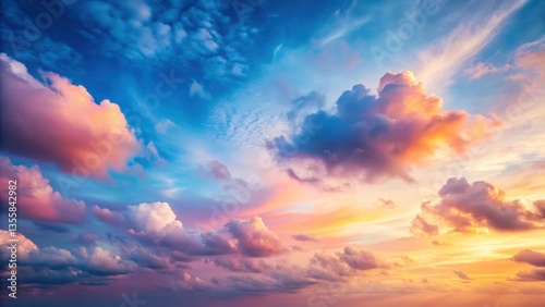 Soft, dreamy gradient sky with light pink and blue clouds, warm sunset hues blending into gentle nightfall, serene, landscape