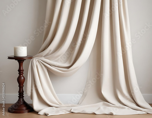 soft, drapery, fabric, curtain, candle, wooden, racked, white, minimal, calm, cosy, elegant, natural, warm, home, interior, decor, composition, layout, neutral, style, simplicity, balance, soft light, gentle, contemporary, modern, smooth, clean, perspective, detail, atmosphere, photo, artistic, fresh, concept, stylish, object, sophisticated, texture, minimalist, peaceful, creative, arrangement, decoration, abstract