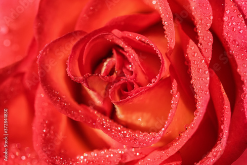 Soft focus, abstract floral background, red rose flower with water drops. Macro flowers backdrop for holiday design