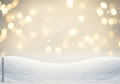 Soft focus bokeh lights and falling snow over a pristine white snowdrift, creating a magical and serene winter holiday atmosphere with a warm, inviting glow