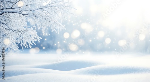 Soft focus winter landscape with snow covered trees and gentle falling snowflakes creating a serene and magical atmosphere with bokeh lights in the background
