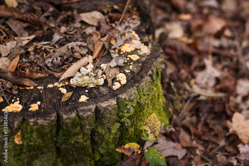 Soft focused close up shot of tree stump with burl, burr, bur, parasite mushrooms
