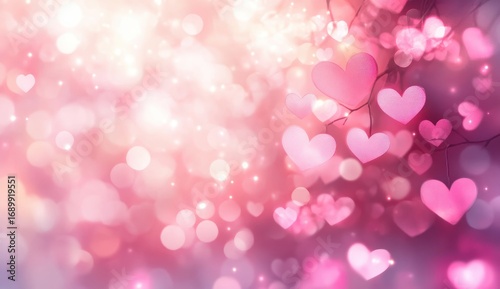Soft glowing abstract background with pink heart shapes and bokeh lights evoking warmth and romance